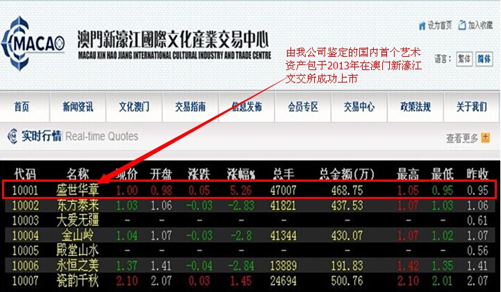 我公司的鉴定项目《盛世华章》已于2013年6月22日在澳门新濠江国际文化产业交易中心正式挂牌上市交易,《盛世华章》也是该交易中心艺术产权的首次出售与上市交易。目前交易状况良好,稳中有升!(在交易中心首页即可看到交易实况)